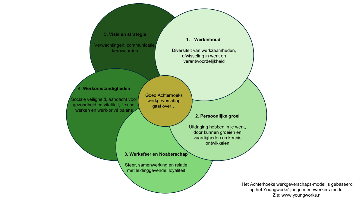 Daarbij gebruiken we het model voor Achterhoeks Werkgeverschap. XOET ontwikkelde dit model, gebaseerd op het model van Youngworks. Het draait om typische Achterhoekse waarden: persoonlijke betrokkenheid, noaberschap, werk-privébalans en werkplezier.